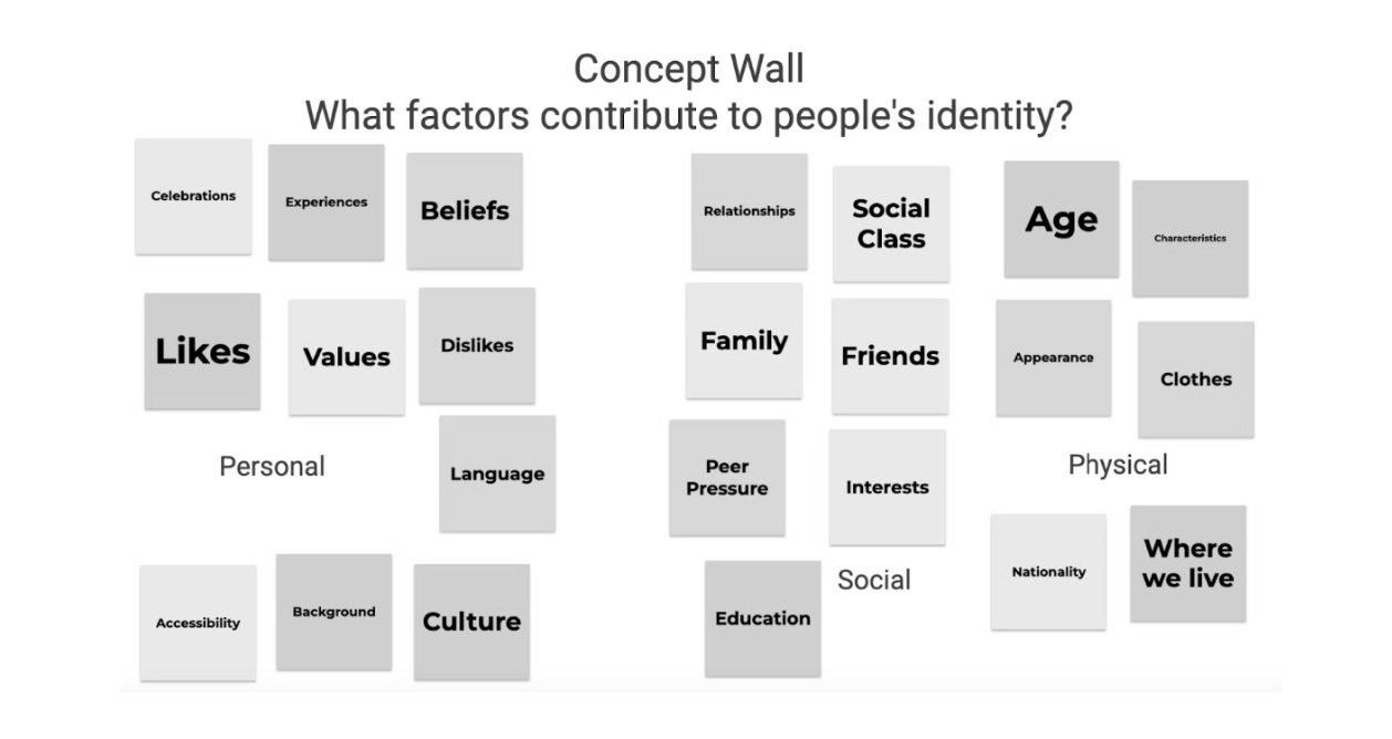 A concept wall, where throughout the learning students continually add their ideas connected to the understanding question. As ideas are added students make connections and look for patterns, building their conceptual understanding.